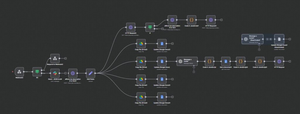 Nous avons développé un workflow avancé utilisant n8n, Google Docs, Google Drive, Monday.com, Axonaut et l’IA GPT pour automatiser l’ensemble du processus documentaire.